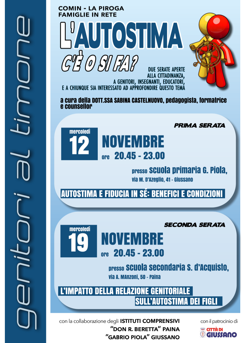 La comunità diurna La Piroga, da anni attiva nel territorio di Giussano, anche in sinergia con il nostro Istituto, organizza un percorso di due incontri sul tema della autostima. Entrambi gli incontri saranno tenuti dalla dottoressa Sabina Castelnuovo, pedagogista, formatrice e counselor.