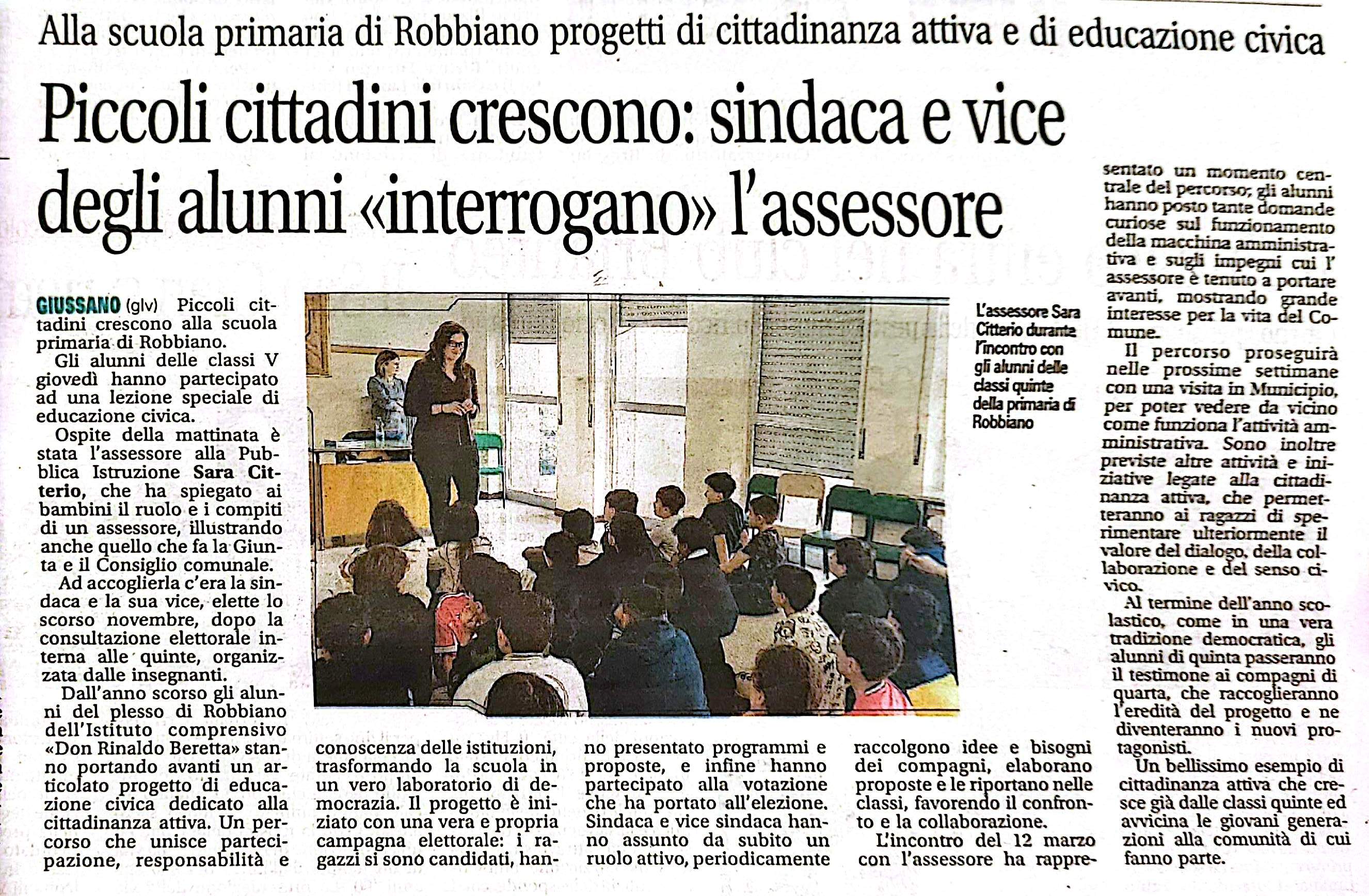 Da novembre gli alunni delle classi quinte del plesso di Robbiano dell’Istituto Comprensivo Don Rinaldo Beretta stanno portando avanti un articolato progetto di educazione civica dedicato alla cittadinanza attiva. Un percorso che unisce partecipazione, responsabilità e conoscenza delle istituzioni, trasformando la scuola in un vero laboratorio di democrazia.