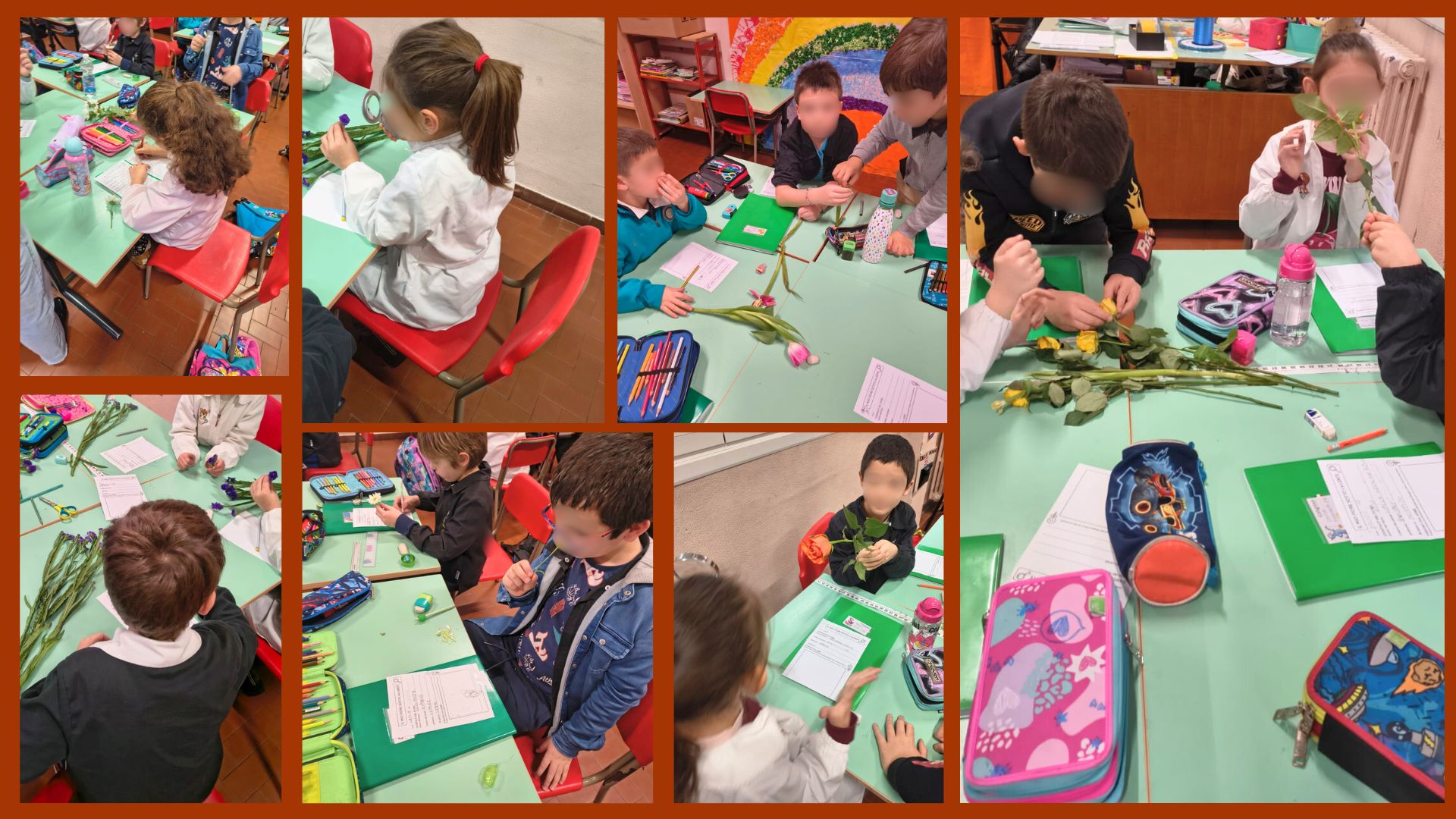Osservazione di diversi tipi di fiori con lente d’ingrandimento.