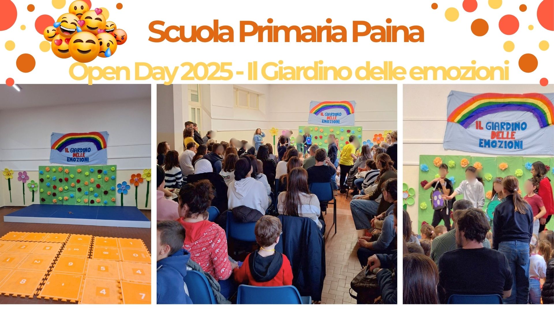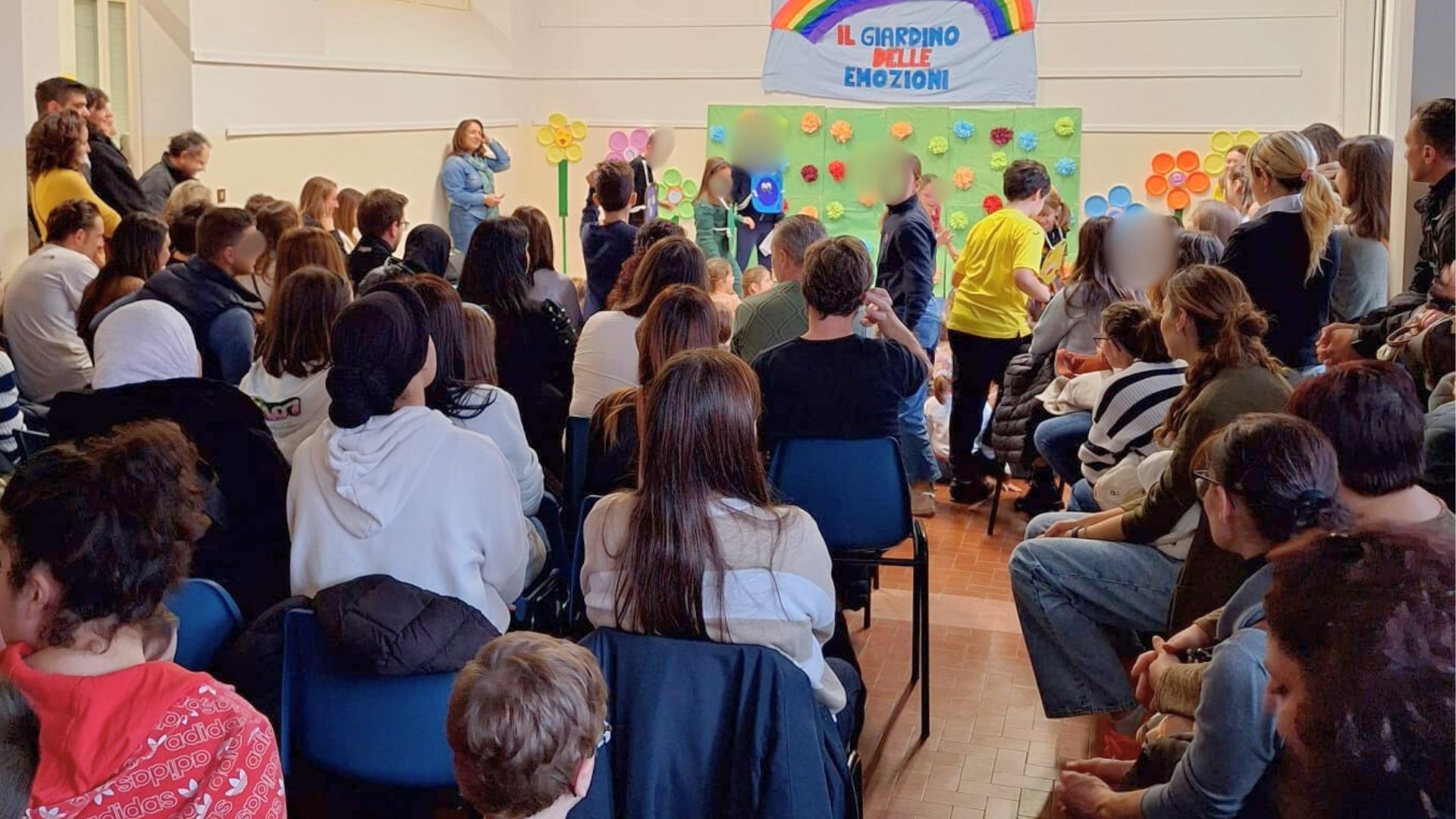 Genitori e bambini vengono accolti in un clima festoso e sereno. Sul palco, gli insegnanti presentano brevemente il tema, spiegando l’importanza di educare alle emozioni e all’empatia. Segue una breve recita con accompagnamento musicale realizzata dagli alunni di classe quinta, che rappresentano in modo simbolico le diverse emozioni e il loro valore nella vita quotidiana.