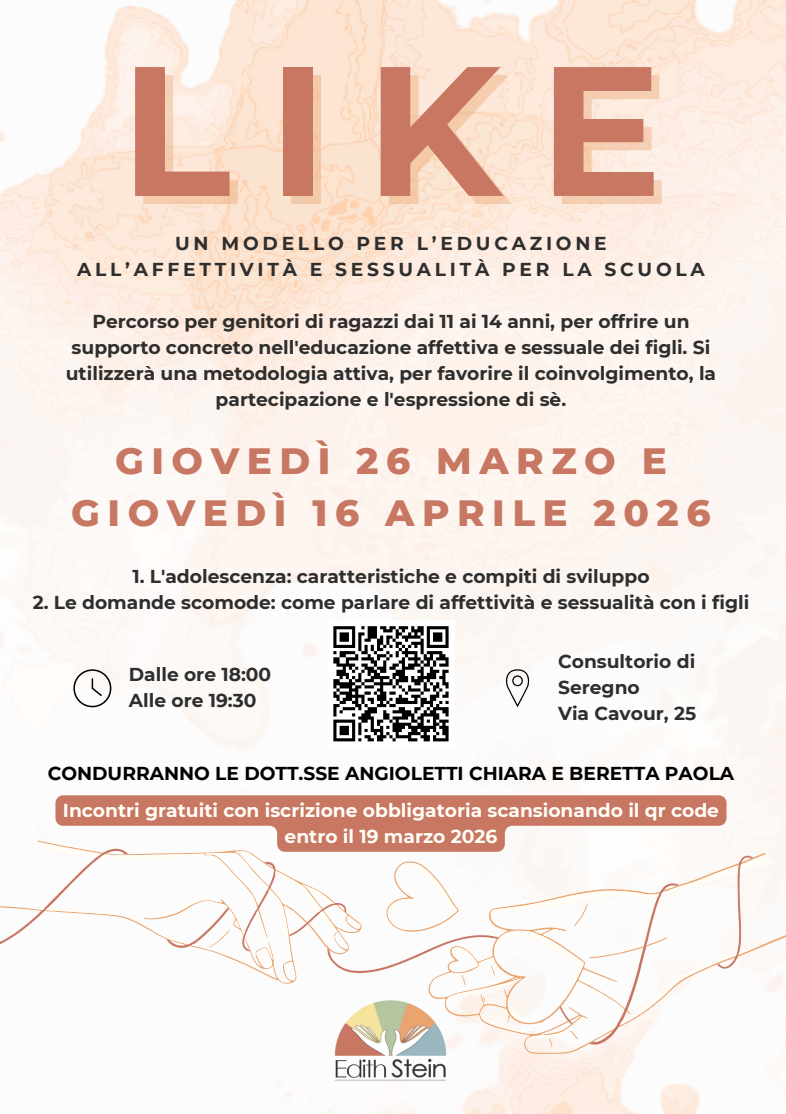 Ai genitori degli alunni della scuola secondaria è offerto un ciclo di incontri e laboratori all'interno del Progetto Like, affettività e sessualità. Il progetto nasce con l'obiettivo di offrire un supporto concreto e strumenti pratici per affrontare con consapevolezza il delicato tema dell'educazione affettiva e sessuale dei figli durante l'adolescenza.